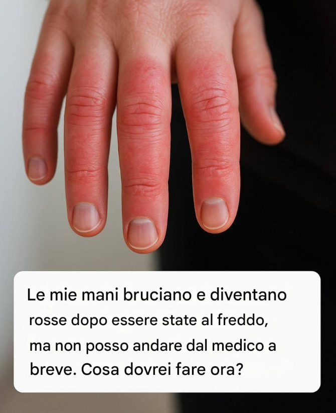 Mi dispiace che tu stia affrontando questo problema, sembra fastidioso e preoccupante. Ciò che descrivi (bruciore e arrossamento alle mani dopo l'esposizione al freddo) potrebbe essere un segno del fenomeno di Raynaud , una condizione comune in cui i vasi sanguigni delle dita delle mani (e a volte dei piedi) reagiscono in modo eccessivo al freddo o allo stress, causando una riduzione del flusso sanguigno seguita da una fase di "rimbalzo" reattiva che provoca bruciore, pulsazioni e arrossamento mentre il sangue torna indietro.