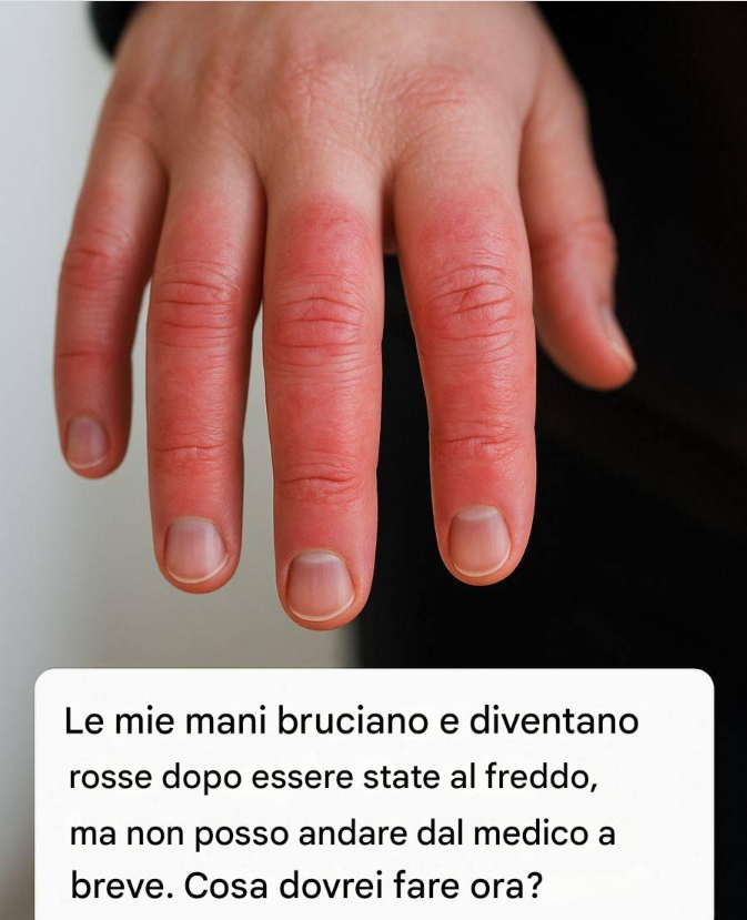 Mi dispiace che tu stia affrontando questo problema, sembra fastidioso e preoccupante. Ciò che descrivi (bruciore e arrossamento alle mani dopo l'esposizione al freddo) potrebbe essere un segno del fenomeno di Raynaud , una condizione comune in cui i vasi sanguigni delle dita delle mani (e a volte dei piedi) reagiscono in modo eccessivo al freddo o allo stress, causando una riduzione del flusso sanguigno seguita da una fase di "rimbalzo" reattiva che provoca bruciore, pulsazioni e arrossamento mentre il sangue torna indietro.