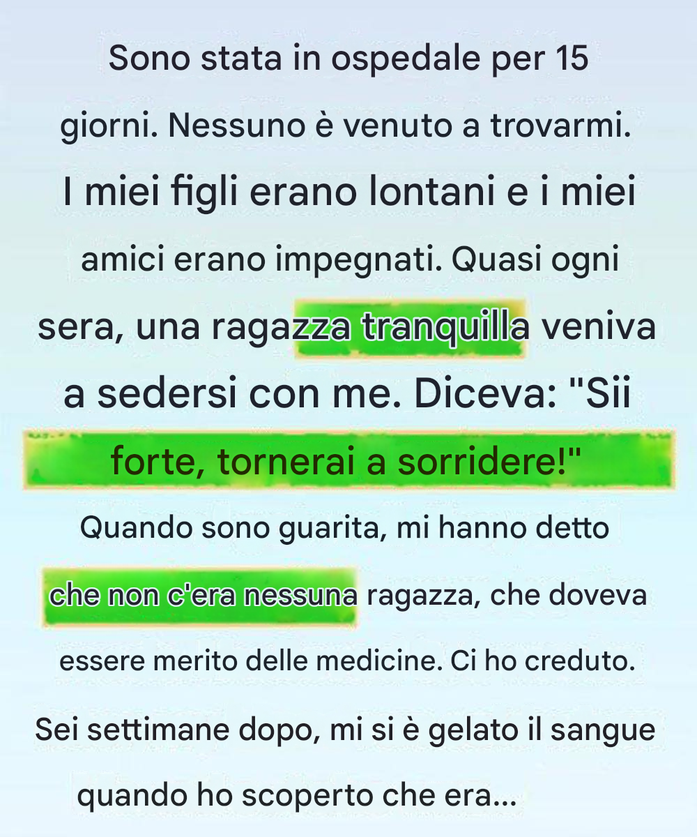 Non si è presentata né ha spiegato il motivo della sua visita. Si è semplicemente seduta accanto al mio letto, avvicinando una sedia, con le mani giunte, come se quel posto le appartenesse di diritto. Io non riuscivo a parlare né a fare domande, ma in qualche modo lei ha capito.